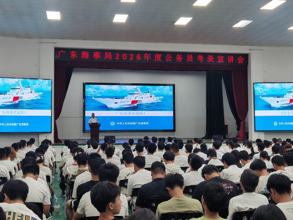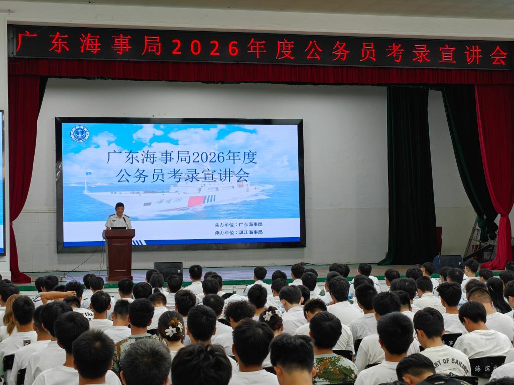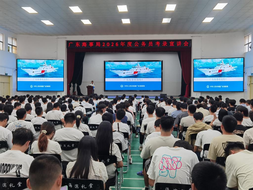 10月11日下午,由广东海事局主办、湛江海事局承办的2026年度公务员考录宣讲会在我校海滨校区举办。湛江海事局人事教育处处长刘志国校友,湛江东海岛海事处东简海巡执法大队大队长赵瑞风校友,湛江霞山海事处宝满海巡执法大队副大队长杨坤鹏校友,船海学院正处级辅导员、党委副书记齐昊,院团委书记郑祯远以及400余名师生等参加本次活动。