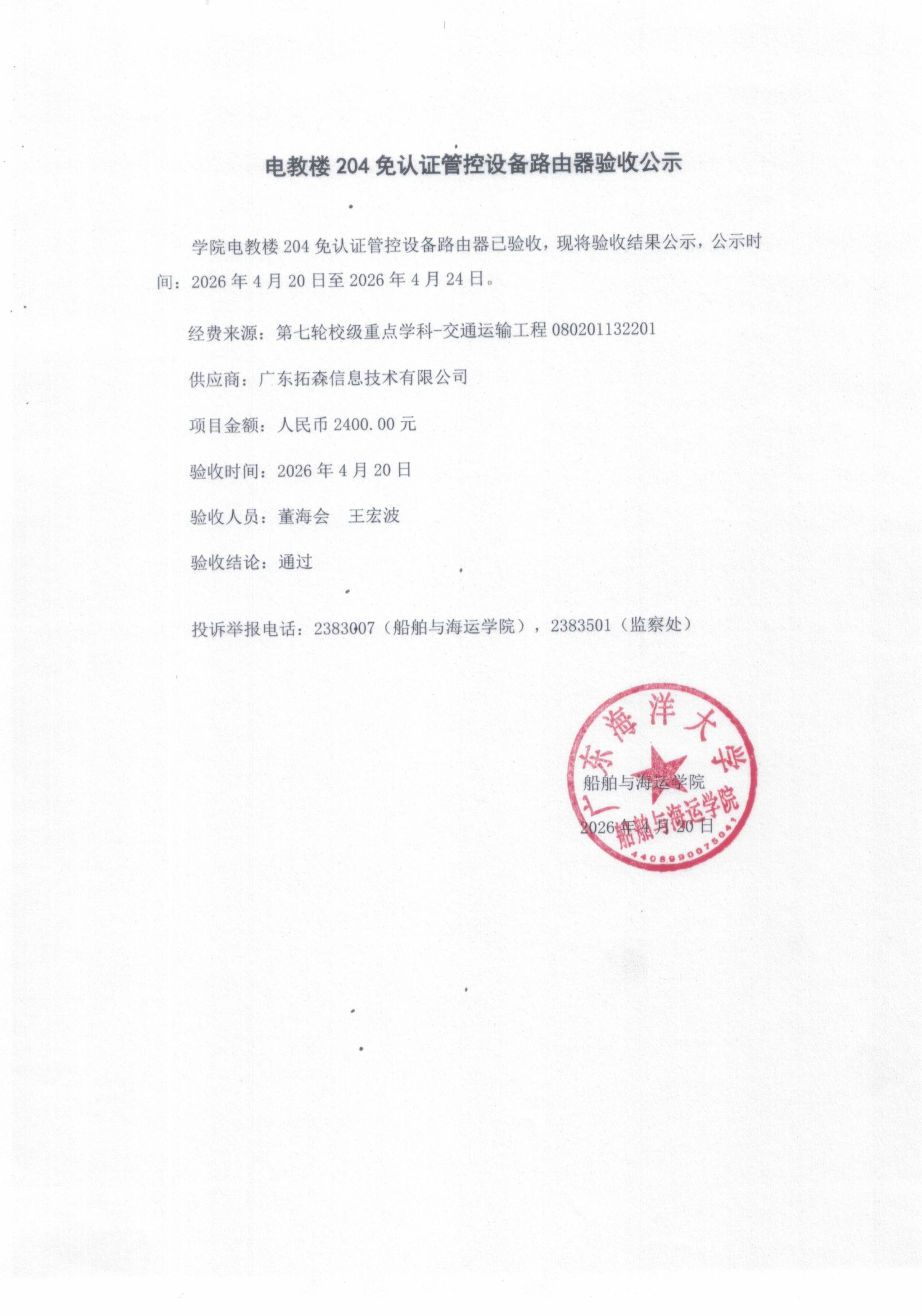 电教楼 204 免认证管控设备路由器验收公示