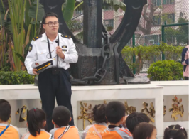 基地广场上,黝黑厚重的船锚雕塑刚映入眼帘,就引来孩子们阵阵惊呼:“哇!这个铁钩子比我还高!” 大家争先恐后围拢过来,小手触摸着冰凉粗糙的钢铁纹路,踮脚打量锚爪的奇特形状。讲解员蹲下身用童趣语言科普:“这是大船的‘超级安全带’,锚爪像有力的大手,能牢牢抓住海底泥沙,就算上万吨巨轮也能稳稳固定!” 孩子们听得目不转睛,纷纷举手追问 “怎么扔到海里”“怎么拉上来”,讲解员用手势模拟下放、抓取、回收的过程,生动演示让知识点瞬间变得易懂,清脆的笑声在雕塑旁久久回荡。